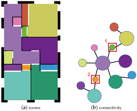 We can see two small rooms with orange and light green colors, each with two doors. Figure 7b shows a room connectivity graph where circle sizes represent room sizes. This is generated by the room connectivity extraction method, which will be described in Section 4.3. Considering the role of these rooms, which is to connect large rooms, it is unnatural for such short “corridors” (we call them “rooms” in this paper) to have two doors. Therefore, we set a rule to remove such a door based on the number of adjacent rooms, the room size, and the connected walls. Figure 6c shows the result of window and door detection where they are colored red.