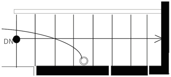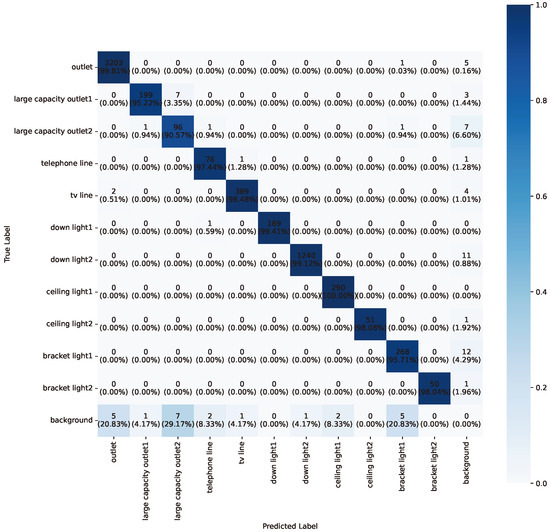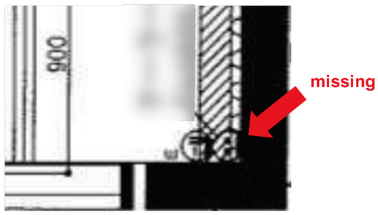 Detection instances with IoU scores greater than 0.5 were considered correctly detected, and the evaluation metrics were computed based on this criterion. This leads to a high accuracy, i.e., a 97.7% F-measure, as shown in the table. In particular, symbols located in the central and spacious areas of the room, such as “downlight” and “ceiling light”, are extracted with a high accuracy. However, symbols situated along the walls, such as “large capacity outlet”, “telephone line”, and “bracket light”, indicated a relatively lower accuracy. Figure 13 shows an example of a missing case.
