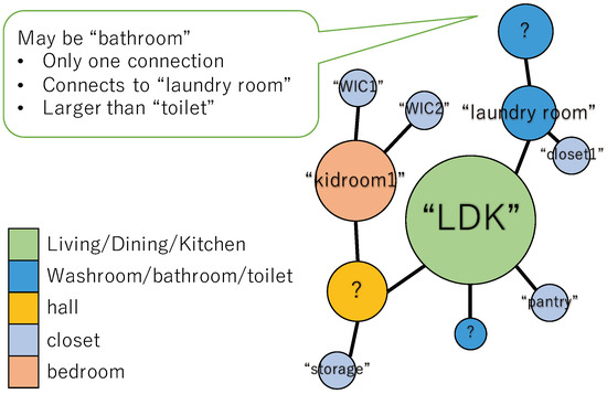 Some rooms’ names cannot be recognized by the abovementioned technique due to noise, the lack of some characters, and several other reasons. However, we may infer a room name based on the room size and the adjacent room information, such as the number of rooms, name, and room type. For example, a bathroom is often adjacent to a dressing room, a hall is adjacent to many rooms, and a storage room is smaller than a bedroom. Therefore, as shown in Figure 9, we estimate the room name based on the above structural features when the character string cannot be detected and recognized.