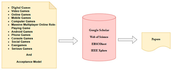 - Study Selection: To ensure the comprehensiveness of the review, twelve distinct terms were used to explore the concept of digital games. Each term was used individually and in conjunction with the term “acceptance model” during the search process, as illustrated in Figure 1.