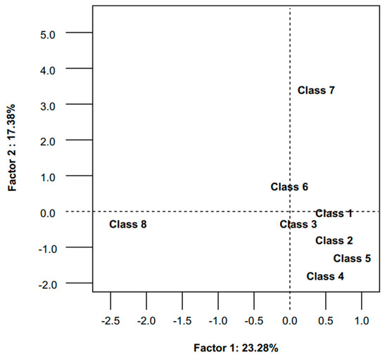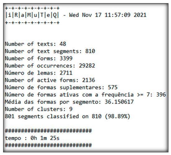 To create classes (or clusters), Iramuteq employs Multiple Correspondence Analysis, considering the construction of frequency tables to identify the words with the highest frequencies and their relationships. The software generates a multidimensional space where coordinates represent each word and document. Subsequently, clustering techniques are executed based on the resulting coordinates from Multiple Correspondence Analysis (such as the K-means method, for example). Following this step, Iramuteq identifies patterns in the relationships between words and documents, grouping those that share similar characteristics. After the creation of classes, the software allows for the visualization of results through graphs and tables that facilitate interpretation [64,65].