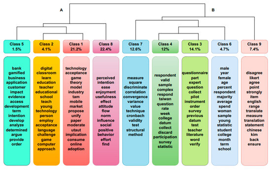 The DHC revealed nine classes originating from two main branches of the total corpus analyzed, sub-corpus A and sub-corpus B. Sub-corpus A is composed of Classes 1, 2, 5, and 8, whose TSs present the words used in the abstracts and the keywords. Sub-corpus B is composed of Classes 3, 4, 6, 7, and 9, whose TSs present the words used in the methodologies. The DHC and its subdivisions are shown in Figure 3.