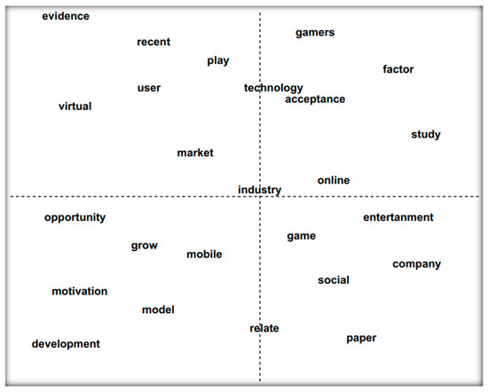 The word “industry” related to the words in this class, except to the words “network” and “phone”, requiring the production of a new concept map. The concept map resulting from the word “industry”—see Figure 4—suggests that this was the great inspiration for most of the works presented in this investigation, establishing an association with the words game, mobile, online, user, marketing, grow, virtual, internet, behavior, and consumer, for example.