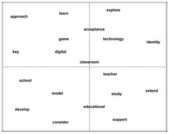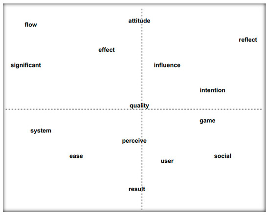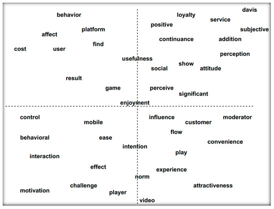 Firstly, words displaying a p-value of less than 0.005, indicating statistical significance, were analyzed and considered for inclusion. Secondly, certain words that were deemed unsuitable for conceptual ideation, such as “research”, “study”, “acceptance”, “questionnaire”, “finding”, and “conclusion”, were eliminated from the selection process. Subsequently, words were included based on their frequency of occurrence within the text segments. Only words that appeared ten times or more in the total text segments were retained for further analysis. These chosen words were seen as pivotal in representing the conceptual dimensions within the corpus.