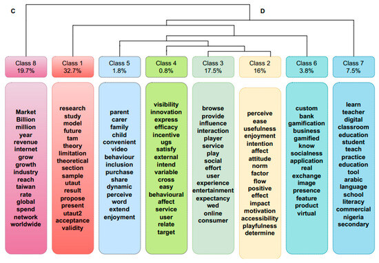 Class 1 suggested meanings around the word “industry” (with 100% occurrence in the corpus). This class, as a dimension, suggests that the most recurrent themes refer to the consumption of people (consumer—81.82%) in a given industry (industry—100%) in a specific market (market—76%) that involves entertainment attributes (entertainment—69.23%) and relationships (network—64.29%), which also involves offering services through mobile phone (phone—50%), stimulating behavior (behavior—44.12%) of service use in mobile games (mobile—43.36%) through the use of the internet (online—36.62%)—Table 2.