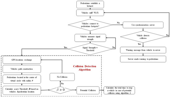In the first phase of our scheme, a VRU smartphone creates a WIFI hotspot, and nearby vehicles search for available hotspots and attempt to connect to them using their OBUs. Once a pedestrian-vehicle connection is established, the signal strength is measured to estimate the distance between the two parties. If the signal strength exceeds a certain threshold, suggesting that the distance between them is dangerously small, a lightweight CDA is executed to determine whether or not there is a real threat of collision. The vehicle and the pedestrian could connect directly via WIFI/DSRC or communicate via cellular network through the synchronization server, which increases system latency.
