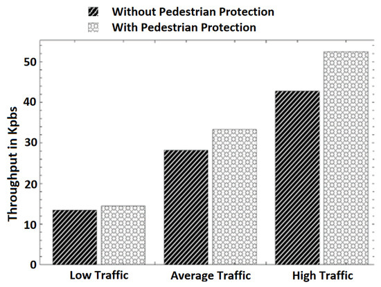 - Average throughput: The average throughput at different traffic scenarios is presented in Figure 6 It can be observed that the throughput increases with an increase in the number of vehicles and pedestrians in both schemes. In different traffic scenarios, the throughput’s increase is expected because the number of transmissions increases as the number of vehicles and pedestrians grows. We observed that our scheme introduces slightly more throughput in all traffic scenarios than the pure V2V scheme. This is because pedestrians’ engagement in communication with vehicles introduces more transmission and the reception of data. However, the increase in the throughput introduced by our scheme is minimal. For example, it can be observed that the throughputs of the pure V2V scheme and the scheme with pedestrian protection in the average traffic scenario are 28.21 and 33.28 Kbps, respectively. This is a 15% throughput increase introduced by our scheme for pedestrian safety. In addition, the throughput increase is only 8% in the low-traffic scenario.