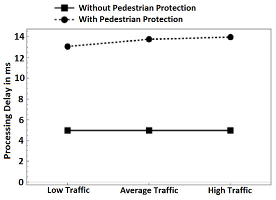 Figure 7. Processing delay in different traffic scenarios. - Network load: The number of packets transmitted throughout the simulation time at different traffic scenarios is shown in Figure 8. It can be observed that the number of packets increases with an increase in the number of vehicles and pedestrians involved in communication. This is normal behavior because of the increase in packet transmission. When comparing the pure V2V scheme with our scheme, we can observe that our scheme has more packets transmitted. We attribute the increase in transmitted packets to the pedestrians’ communication with vehicles. The increase in network load due to the use of our scheme is negligible. For example, our scheme transmits 73,967 packets while the pure V2V scheme transmits 71,712 packets in the low-traffic scenario. This is an increase in the transmission of 2255 packets only (3%), which is a small bandwidth cost for protecting pedestrians.
