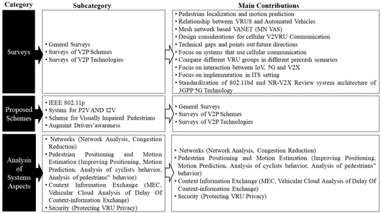 These categorizations affect V2P system design. The VRU movement patterns and reaction times differ from autos, pedestrians, cyclists, and powered two-wheelers [42]. Children walk haphazardly, whereas older and handicapped people move slowly [43]. Variations affect the VRU’s role and device selection. Kids prefer tag-based unilateral communication since they cannot be VRUs. Various efforts have been made to develop V2P communication, with the goal of overcoming possible problems by adjusting the interaction of various aspects. Figure 11 classifies and provides an overview of the various V2P design initiatives based on the three design criteria: VRU type, the technology employed, and the VRU device.