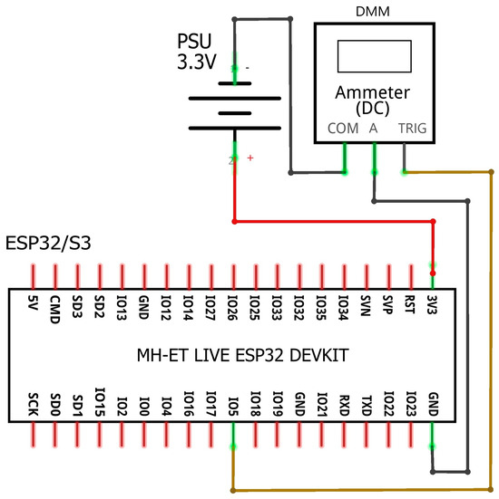 The PSU was adjusted to deliver an output of 3.3 Volts. Following this, the current port of the digital multimeter (DMM) was connected in series with both the PSU and the board undergoing measurement. To capture sample readings exclusively during the inference phase, an output pin on the board was designated as a trigger output. We selected GPIO5 for both boards since this pin was available and not used for any secondary function during the booting of both ESP32 and ESP32-S3. GPIO5 was set as output floating with an active low setting. This minimized any extra power consumption from GPIO peripherals since driving an output high requires, practically, more power than driving it low since the output is connected to the measurement instrument, and although the instrument input theoretically has infinite impedance, in reality a small current flow exists. The output was set to a low level just prior to each inference in code execution in the MCU. This pin was then linked to the external trigger port of the DMM, thereby creating a negative edge trigger event for the DMM. The setup of these connections is illustrated in the diagrams below (Figure 1).