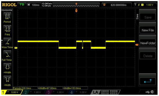 Some of the examples ran more than one inference per code loop. For each such example, we either present one inference in our results, when all the inferences were of the same load (same power consumption result for each one of them), or we present the sum of our measurements for each cycle when different inferences—at least two of them—were of significantly different computational load. This means that during an example execution loop, there may be multiple trigger events, as depicted in Figure 3. The color detection model in fact runs, in a single run, three different inferences, generating three trigger events that are indicated on the figure as three falling edges. The low-level period after each falling edge is the inference latency time of each inference.