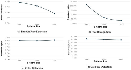 The human face detection model (to which the results shown in Table 4 are related) is considered a “medium size/load”. From these results, it is apparent that the I-Cache size has minimal effect on both inference time and inference power consumption, while the D-Cache size has a large impact on both. In fact, going from 16 Kbyte to 32 Kbyte increases efficiency by nearly 18%, while increasing cache size to 64 Kbytes halves the power consumption, indicating 53% better power efficiency. Keeping the best cache result of 64 Kbytes of D-Cache and switching to single-stage inference quadruples the power efficiency by dropping the power consumption to 0.461 µWh per inference from 3.843 µWh with 16 Kbyte of D-cache and dual-stage inference.