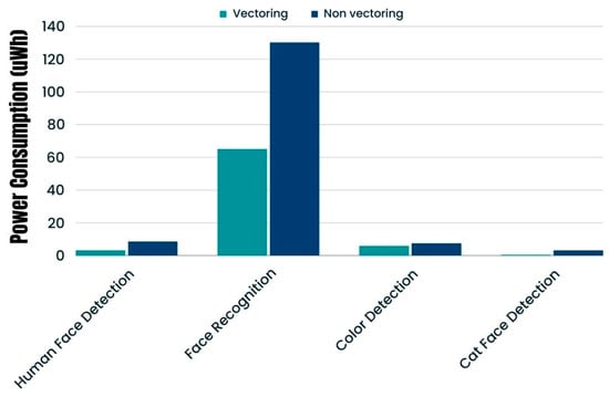 The cat face detection model is the most lightweight model of our experiment. Again, because of its small size, increasing the cache size has no real effect on the power efficiency of the model; however, vectoring has a large impact on power consumption, improving it by almost 85%. This power efficiency improvement is a result of increased data processing efficiency because of ESP32′s vectoring instructions. In fact, this capability enables ESP32-S3 to complete the inference function nearly seven times faster that its ESP32 counterpart (Table 7).