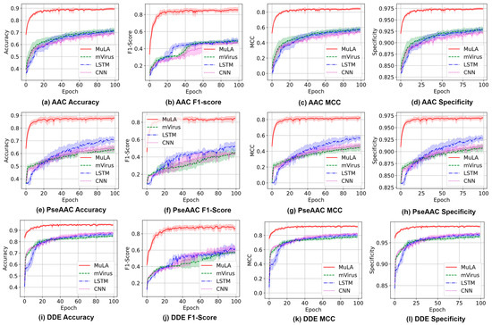 Figure 5 shows the results of 100 epochs for CNN, LSTM, Virus-mPLoc, and MuLA models, displaying both the average performance (line plots) and the corresponding standard deviation (shaded region around the line plots), offering a comprehensive view of the model’s variability. The MuLA network performs better and converges faster than the Virus-mPLoc, LSTM, and CNN deep learning networks for the three descriptors. MuLA networks have lower standard deviation than the other models, which proves MuLA is more consistent and has less variability.