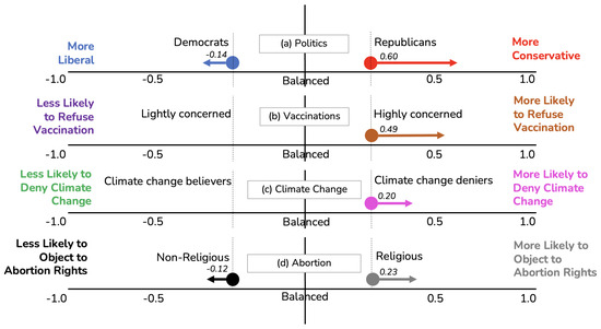 Notable examples of the backfire effect in the literature. The figure represents the backfire effect observed in four studies covering (a) politics [3]; (b) vaccinations [13]; (c) climate change [9]; and (d) abortion [6]. In each of these studies, groups exhibited the backfire effect after being subjected to an opposing view. Note: Each of the horizontal axes should be read independently. Results from the cited papers have been normalised to be presented on a scale from −1 to 1. The figure demonstrates the direction and magnitude of the backfire effect for one or more groups in each study, showcasing that Republicans, people highly concerned with vaccination side effects, climate change deniers, and religious people are more likely to become more conservative, more likely to refuse vaccination, more likely to deny climate change, and more likely to object to abortion rights, respectively, after being subjected to opposing views. At the same time, Democrats and non-religious people exhibit a much lower backfire effect in magnitude than their Republican and religious counterparts, respectively. Counterpart views are not available for all studies.