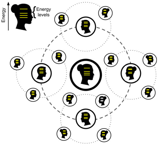 Sketch of a social network showing the social circles and human systems of beliefs represented by discrete energy levels (the horizontal lines superposed on the human head silhouettes). The physical analogy between overlaps of social circles and overlaps of atomic orbitals and concomitant energy level changes underpins the model proposed in this paper.