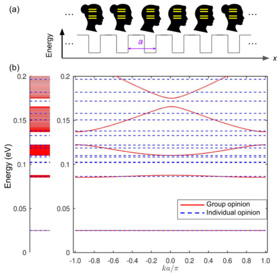 Whereas the discussion above employs the terminology adopted in physics, we can establish a link between the physical concepts and those concepts used in data science and studies of social networks. Indeed, studies of social networks often exploit the notion of periodicity and rely on the Fourier transformation of data [93,94], highlighting the important role of the reciprocal space in analysis of big datasets [95,96]. Hence, readers who do not wish to use the physical language can also comprehend our model using the terminology adopted in the fields of graph signal processing [94], data science [93], or mathematical sociology [95]. Moreover, we present energy level plots alongside the dispersion diagrams, helping readers understand the mainstream discussion, without the need to use the concepts of wavevector and Brillouin zone. We also note that the depth and width of the wells used in our model can be made nondimensional, enabling the users of the model to employ the system of measure that is typical in their field of research. For example, the spacing between the discrete energy states can be related to the social distance [97] or opinion distance in social networks [98,99,100].