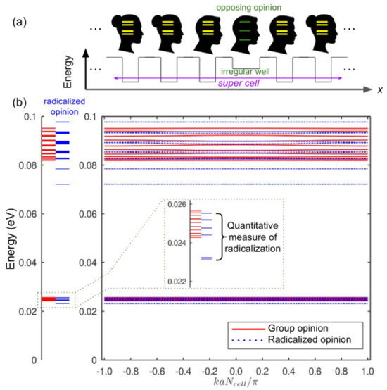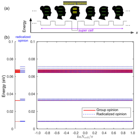 The corresponding model situation is presented in Figure 4a, where persons with the same systems of beliefs, represented by regular potential wells, are exposed to an opposing opinion expressed by another person represented by an irregular potential well. Unlike the regular potential wells that are 0.1 eV deep and 10 nm wide, the irregular well is 0.07 eV deep and 20 nm wide (we remind that the parameters of the wells are chosen empirically and they are meaningful only in the framework of the postulates that underpin our model). Subsequently, the allowed energy levels of an individual irregular well taken alone were significantly shifted with respect to those of an individual regular well. To account for the presence of the irregular well in an otherwise periodic sequence of identical regular wells, we employed a super cell computational approach that is often used to model crystallographic defects, an interruption of the regular patterns of the arrangement of atoms in crystalline solids [61].