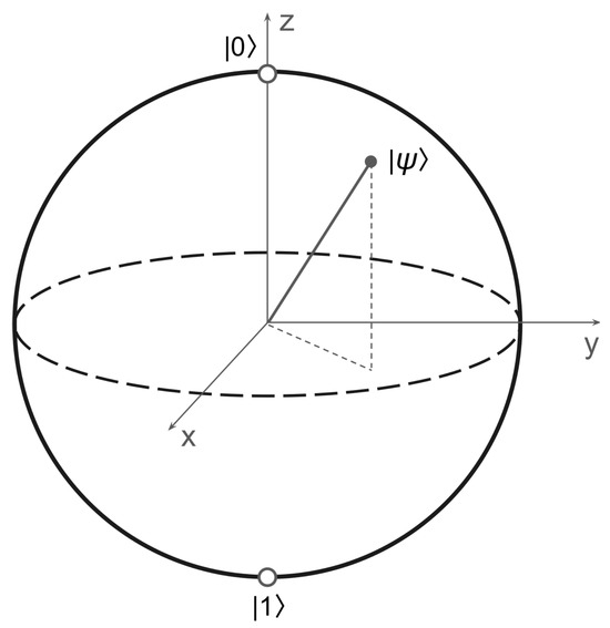 Computational algorithms based on measurements of a qubit are exponentially faster than any possible deterministic classical algorithm [107]. This advantage can be illustrated using the concept of the Bloch sphere (Figure 6) that depicts the multitude of qubit states that can be used to conduct a calculation. When a quantum measurement is performed [35,107], a closed qubit system interacts in a controlled way with an external system, revealing the state of the qubit under measurement. Using projective measurement operators and [107], the measurement probabilities for are and , which means that the qubit will be in one of its basis states. Visually, this measurement procedure means that the qubit can be projected on one of the coordinate axes of Figure 6.