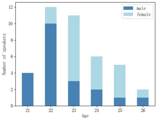 In this paper, a new whisper dataset called Whisper40 has been created. Producing a corpus generally requires the consideration of speaker information, utterance design specifications, recording specifications, data storage technology specifications, and dataset labeling specifications. 40 students were recruited at Beijing Architecture University to participate in the recording of this dataset, including 21 male students and 19 female students, ranging from 22 to 26 years old. The speakers were all native Chinese speakers with no language barriers and were able to speak in whispers. Considering the universal applicability of whispered speech, there are no special requirements for the origin and accent of the speaker. Moreover, these speakers had different places of origin and most of their words were influenced by dialects to some extent, enhancing the diversity of data for speaker verification. Each speaker recorded 20 speeches at a time, with an interval of 2–5 days between each recording. The gender and age distribution of the speakers is shown in Figure 1.