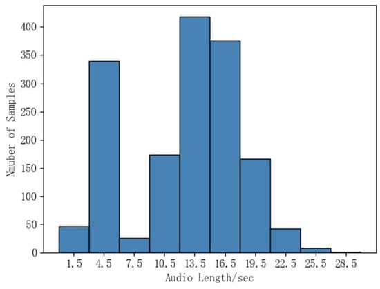In order to be used effectively for the study of WSR, a combination of long and short sentences was chosen for the content of the corpus. Each speaker reads uniform textual content consisting of 40 sentences of neutral speech and 40 sentences of whispered speech, of which, the first 30 are long sentences with an average duration of 15.17 s and the last 10 are short sentences with an average duration of 4.01 s. The sampling rate of these recordings was usually 16 kHz or 44 kHz. The audio files were recorded in 2-channel stereo format and then converted to mono 16 kHz sampling rate wav format after preprocessing. The length distribution of whispered speech is shown in Figure 2.