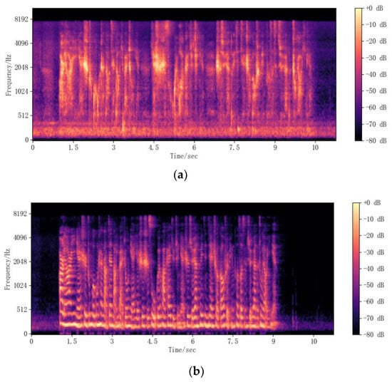 Mel spectrograms of whispered speech compared to neutral speech. (a) Mel spectrograms of whispered speech. (b) Mel spectrograms of neutral speech.