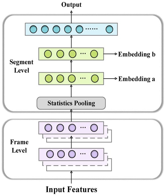 TDNN is a feedforward neural network with a multilayer structure. Unlike fully connected feedforward neural networks, the output units of TDNN are only connected to the input units within a certain time range. Thus, it captures the temporal relationships between neighboring frames. It aggregates variable-length inputs across time to create fixed-length representations that capture speaker features. The shallow network units are connected over a narrow time range, while the deep network learns information over a wider time range. The network structure of TDNN is shown in Figure 4.