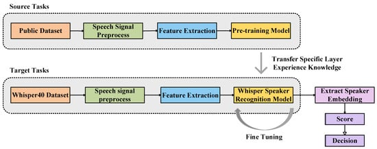 Because of the limited research on WSR, few studies have attempted to explore its relationship with neutral speech speaker recognition. Significant progress has been made in the research on neutral speech speaker recognition. Among them, factor analysis and DNN-embedding-based methods [,,] are considered to be the most advanced in the field of speaker recognition. The mainstream methods are TDNN-based x-vector, ResNet34-based r-vector, and ECAPA-TDNN []-based speaker embedding extraction. Also, since TDNN is a highly competitive model in the field of speaker recognition, it does not require the precise localization of tokens during its training and is able to express the relationship of speech features in the time dimension. Therefore, this network is introduced in the methodology of this paper. Meanwhile, this paper, for the first time, uses the ResNet34 and ECAPA-TDNN model to train the WSR system and compares the effect with the TDNN model to find the most suitable recognition model for whispered speech. Despite the displacement of the low-frequency resonance peaks in whispered speech compared to neutral speech, it also contains a large amount of content and speaker information. Therefore, the feature and embedding extraction methods for neutral speech speaker recognition are instructive for WSR. Transfer learning is a method of transferring knowledge structures from related domains to complete or improve the task in the target domain, which has been widely used in the fields of speech synthesis and target recognition []. Therefore, in this paper, transfer learning is introduced to use the pre-training specific network layer parameters of TDNN as the initial values of the model for WSR. These parameters are used to initialize and fine-tune the parameters of the model trained on the whisper data in order to improve the accuracy of the WSR.