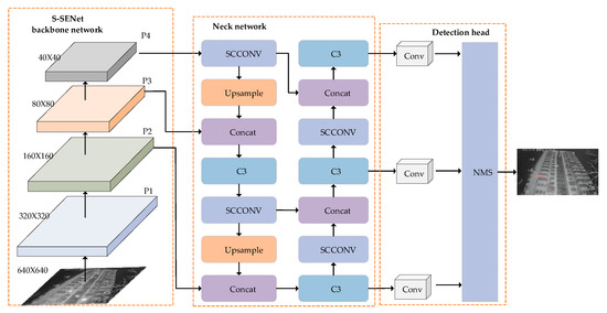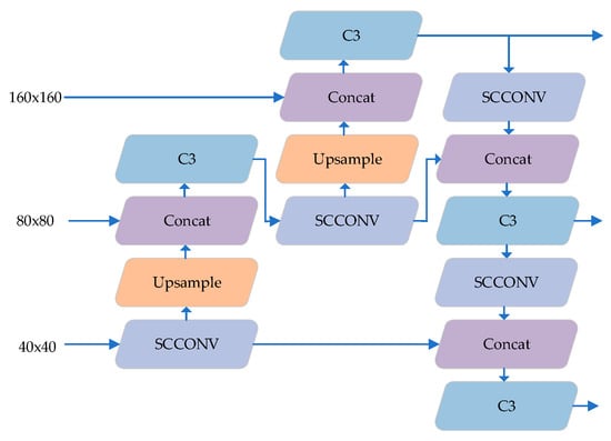 In this study, a novel lightweight feature enhancement module, named SCPANet, is constructed based on SCConv, as demonstrated in Figure 5. In the PANet structure, SCPANet reduces the computational overhead by replacing the traditional 3 × 3 convolutional layers.