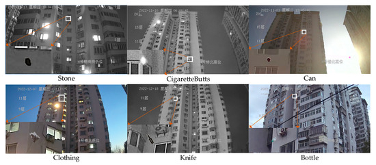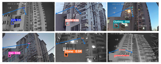 This paper collects a dataset of objects thrown from tall buildings using community surveillance and selfie images. It encompasses six types of objects: cigarette butts, stones, plastic bottles, cans, knives, and clothing. The dataset captures a wide range of community scenes, various viewpoints, different weather conditions, and multiple throwing actions, enhancing the model’s ability to generalize. Many data augmentation techniques—such as level flipping, Gaussian blur, random translation, and affine transformation—are employed to combat model overfitting during training. These techniques are randomly combined to enrich the dataset. Figure 7 presents examples of the thrown object images. The dataset includes 11,064 images, segmented into a training set with 6638 images, a validation set with 2213 images, and a test set comprising 2213 images, following a 6:2:2 ratio. The image count for each object type is 2561 for cigarette butts, 1047 for stones, 2410 for plastic bottles, 2310 for cans, 1230 for knives, and 1506 for clothing.