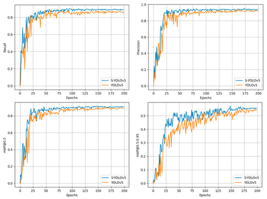 YOLOv5 utilizes a K-means clustering algorithm to generate anchor frames automatically based on a statistical analysis of different-sized targets in the training set. This study uses stochastic gradient descent (SGD) as the optimizer and employs a cosine annealing strategy to regulate the learning rate [27]. The same parametric strategy is adopted to train the S-YOLOv5 model. As shown in Figure 8, the model performs better in training and validation loss than the original YOLOv5, which reduces the training loss and validation loss by 0.0062 and 0.0020, respectively.