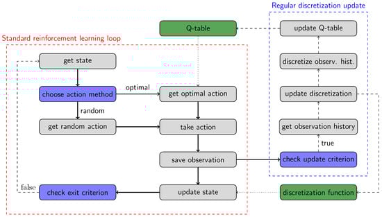 In this section, we present a discretization method integrated into the Q-table-based policy iteration algorithm to solve mixed continuous-discrete problems with a reinforcement learning approach. First, we summarize the key properties of reinforcement learning by highlighting the action-value-based policy iteration methods, especially the every-visit Monte Carlo method and the Q-learning concept. Then we declare the basic requirements for a state compression solution. Finally, we describe the Q-table compression process in detail by providing the pseudo-algorithm to support its implementation.