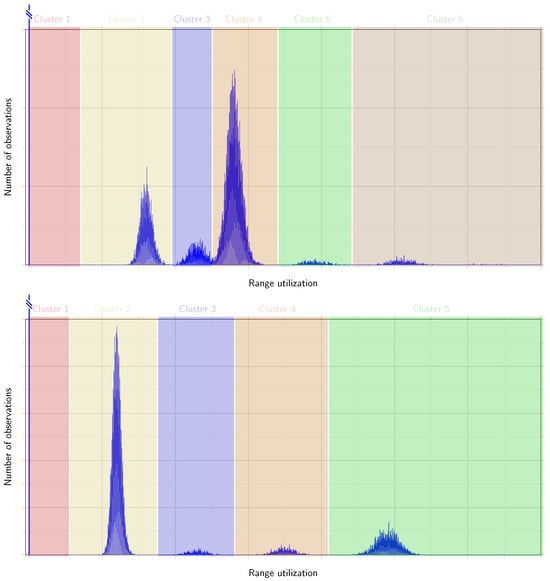 Next to the standard reinforcement learning loop, the agent needs to update the discretization regularly, and on top of that, compress the state space size. The discretization update process is quite resource-intensive. Therefore, we suggest performing it after a batch of episodes. Once, when the update criterion is satisfied (check update criterion) the agent queries the observation history (get observation history). To let the agent act adaptively, the history can be accessible due to a moving observation window to get the most relevant part of the history and not process the old, invalid records from there. The major goal at this stage is to create a new/updated discretization ruleset that fits the requirements as described above in this subsection and projects the mixed discrete-continuous observation space to a discrete state space (update discretization). Denote by an observation, where shows the currently visited vertex of the graph, and describes the current range utilization. The agent takes the observations in a loop: It fixes the discrete part of the observation space (practically a vertex) and queries all matching records: . Then it uses the DBSCAN algorithm to assign the continuous range utilization values of the observations into clusters. Denote the ith range of the corresponding cluster and the number of identified clusters of the vertex v. The ranges should be nonoverlapping: for all , and they need to be widened to completely cover the potential value range: . Figure 2 demonstrate the result of applying DBSCAN algorithm to determine the clusters for two different verices.
