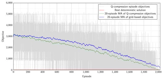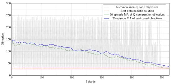 The optimal solution of the deterministic problem has an objective value of 16. The Q-compression method approaches the optimal solution better by reaching an average objective value of than the grid-based method, which produces an average objective value of . However, both show constant convergence to it. Table 3 shows the size of the Q-table by episodes. We can observe that the grid-based method grows the Q-table to an average size of 3647 records, while the Q-compression method leads to less than half the size by having 1735 records on average.