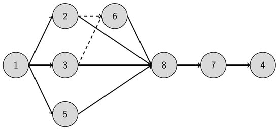 We can distinguish two types of edges: solid edges represent predecessor AND relations, while dashed edges represent predecessor OR relations. The predecessor AND relation () declares a set of predecessor tasks that all must be completed before starting the task i. The predecessor OR relation () declares a set of predecessor tasks of which at least one needs to be completed before starting the task i.