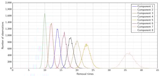 Our third use case is a computer disassembling problem from the literature [32,33]. Similarly to the previous use cases, we apply multiplicative stochastic noise from a log-normal distribution with parameter values of and . There are identified 8 salvageable components of a PC. The parts themselves, their removal times, demand values, and hazardousness indicators are collected in Table 4.