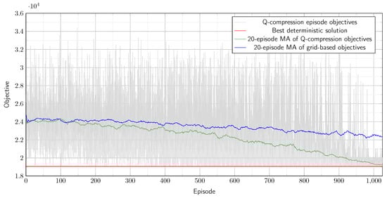 The optimal solution to the deterministic problem has an objective value of 19,065. In this use case, the reward curves of the two discretization methods diverge. The Q compression method significantly better approaches the optimal solution by reaching an average objective value of 19,122.29. In contrast, the grid-based method produces an average objective value of 22,747.21 (Figure 10).