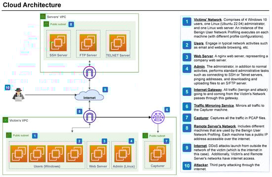The proposed cloud architecture and its intended utilization are outlined in this section, providing an overview of the selected approach and justifying the design of such a cloud architecture. The proposed architecture in Figure 2 shows a comprehensive network configuration to present a real-world corporate environment. This architecture is designed to emulate the complexities and vulnerabilities inherent in such environments, including the potential for DDoS attacks. We have structured the architecture within this environment to reflect typical organizational dynamics. The victim’s VPC represents the internal network of a typical company. It includes four Windows machines for daily normal user activities, such as web browsing and email checking. These users exemplify the end-users typical of the company’s operational environment.