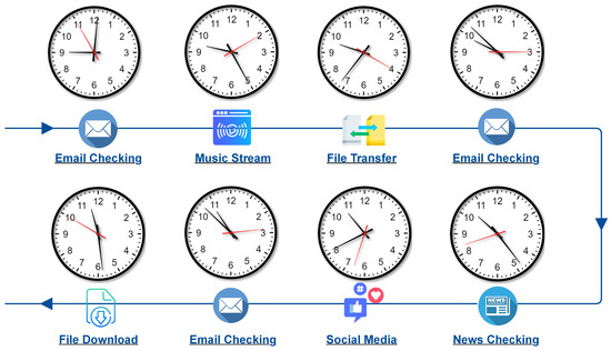 | 10:00, 10:40, 14:20, 14:50, 15:20, 11:30, 12:03, 12: 36, 15:25, 15:35, 15:45 | Web Browsing (Downloading) | File sizes: 5 GB, 228 MB, 4 MB, 4 MB, 4 MB, 1.7 KB, 1.7 KB, 1.7 KB, 100 MB, 100 MB, 100 MB |
