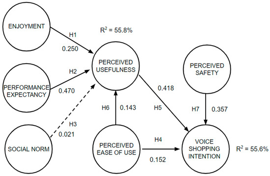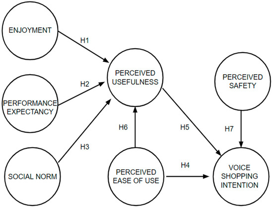 - Perceived Usefulness and Perceived Ease of Use: In the realm of voice shopping, the concept of perceived usefulness refers to the degree to which a user believes that using a system will enhance their shopping experience [9]. Supporting this, ref. [45,46] found that perceived usefulness, alongside perceived enjoyment and innovativeness, significantly impacts millennials’ behavioral intention to use voice-activated shopping technologies. In parallel, perceived ease of use, another fundamental aspect of the TAM, signifies the extent to which a person believes that using a system will be effort-free [9]. This factor is essential in voice shopping, where systems that are user-friendly are more likely to gain acceptance among consumers.