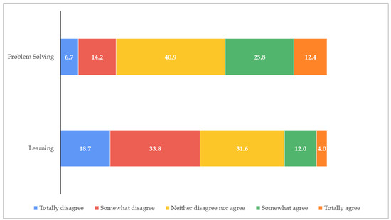 In turn, the AI Self-Efficacy dimension obtained the lowest average response (2.86), highlighting that learning was the factor with the lowest average response (2.49). Specifically in this factor, 65.4% of participants responded with levels 2 and 3, reflecting that they have more difficulty in handling problems and challenges related to AI (see Figure 2).
