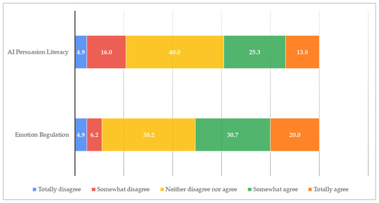 Finally, in the AI Self-Management dimension, which had an average response of 3.41, the AI persuasion literacy factor had an average response of 3.27 and Emotion Regulation had an average of 3.55, revealing respondents’ greater perception of the possibility of controlling their emotions regarding the use of AI than in considering the influence of AI in their daily life (see Figure 3).