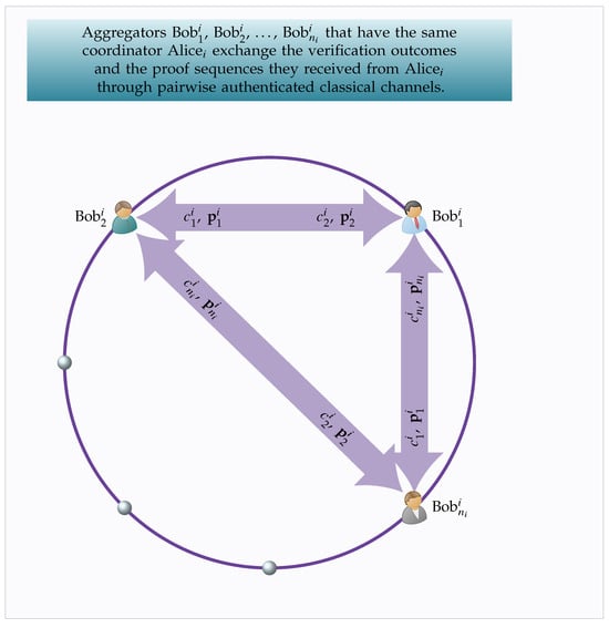 Figure 2. The above figure illustrates the fact that all news aggregators with the same coordinator , i.e., , , …, , can exchange the verification outcomes and the proof sequences they received from through pairwise authenticated classical channels. - (H7)