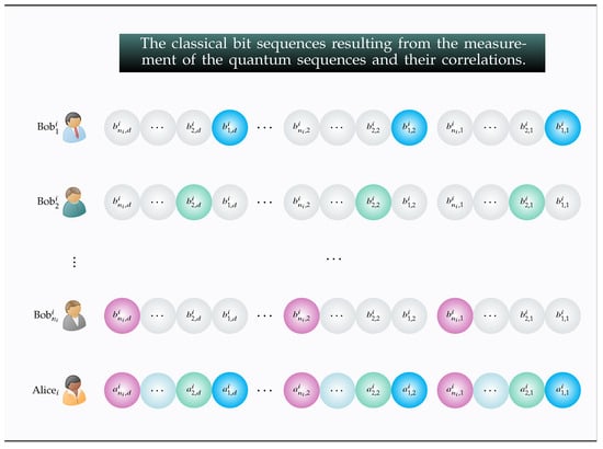 The situation regarding the sequences of qubits distributed to and the Bobs in her active network are visualized in Figure 3.