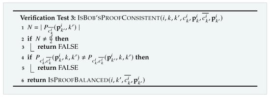According to Theorem 1, the probability that another news aggregator () will manage to construct on his own a proof sequence consistently is negligible. Hence, if the verification test IsBob’sProofConsistent shown in Figure 7 returns TRUE, the logical conclusion is that herself must have sent the consistent proof sequence to .