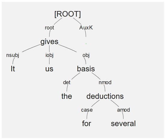 The syntactic “path” from the sentence root to each “leaf” token is given by the combination of head id and dependency relationship. The syntactic function of each word is clearly and specifically defined by these two values. For example, the word basis is the obj of the word gives. obj is the UD label for what is traditionally called the “direct object” of a verb (a list of syntax labels along with examples can be found on the UD website: https://universaldependencies.org/en/dep/index.html, accessed 1 January 2024). The word several is labeled as amod of deductions. amod indicates an adjectival modifier. The word deductions itself is an nmod of basis. In UD annotation, nmod means “nominal modifier”, a noun or noun phrase directly dependent on and specifying another noun (or noun phrase). For example, the prepositional phrase in “toys for children”.