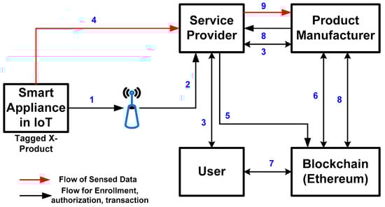 The discussion of the above-mentioned transactional flow exhibited in Figure 1 with steps of flow represented by numerals is as follows: The study considers that a user possesses a smart device that works on an external power supply. The task shown in step 1 is connecting the smart appliance with wireless hotspots, followed by linking with the service provider as a task in step 2. The inbuilt sensing devices within the smart appliances capture their designated surrounding information precisely. The service provider then asks the user if the sensed data are permitted to be specifically collected and if the user is interested in selling the collected sensed data in step 3. Suppose the user responds by playing the role of the seller; then, they are facilitated with the blockchain bearing all the sale data. In such circumstances, the enrollment of the new seller (user) is carried out while the new seller is also required to furnish additional information to the service provider associated with their smart appliances, viz., identity, components, operational configuration, settings, price, etc. At the same time, there is also a fair likelihood that certain manufacturers of objects hosted by smart appliances (also within the smart appliances) are enrolled via the same service provider.
