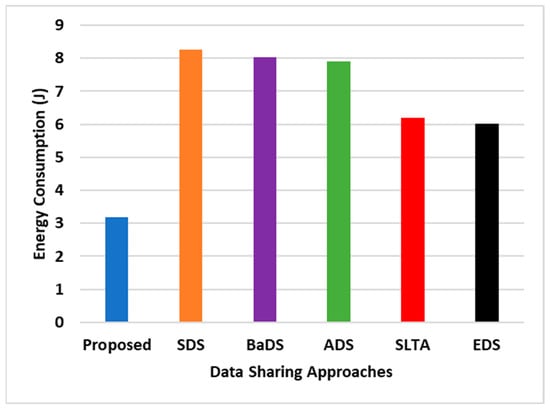 The efficiency and applicability of an IoT architecture are fundamentally reflected in the prolonged sustainability of the sensors deployed within smart appliances. An essential measure to evaluate this aspect is to assess the cumulative energy consumption of smart devices throughout the entire operation of the data-sharing mechanism. This approach is instrumental in highlighting the operational efficiency and sustainability of the implemented architecture, thereby providing valuable insights into its overall performance and viability. The consequential outcomes of this evaluative measure are comprehensively illustrated in Figure 2.