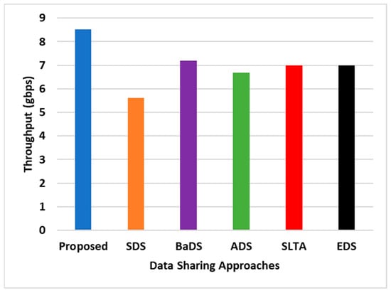 Moving forward to the throughput assessment, this includes the exchange involving requests, responses, and the acquisition of original data by the buyer. An optimized IoT architecture attempting for a lightweight operation should demonstrate a well-structured, scalable, and highly accessible form of blockchain, provided that its throughput demonstrates significant enhancement. Figure 3 displays the comparative results, presenting the throughput performance of the proposed SEaaS model relative to the existing blockchain-based data-sharing schemes. This comparative analysis highlights the effectiveness and efficiency of the proposed model, affirming its suitability and robustness in the context of contemporary IoT architectures.
