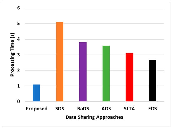 Lastly, Figure 5 focuses on the algorithm-processing time, which is crucial for evaluating computational efficiency. SEaaS demonstrates approximately a 25% reduction in processing time compared to other models, primarily due to transaction validation and confirmation times. Different blockchain forms may vary in confirmation times, affecting processing times. SEaaS supports concurrency and parallelism within smart contract design, offering performance not typically observed in conventional data-sharing schemas.